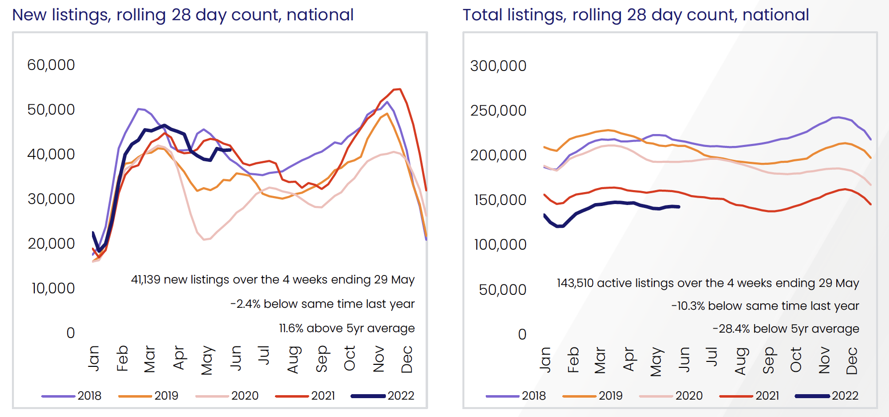 41,139 New Listings over the four weeks ending 29th May, being 2.4% below the same time last year and 11.6% above the 5-year average; however, comprehensive listings are still -28.4% of the national five-year average and 10.3% below the same time last year. Stock is limited on the market, but buyers will have more power to bargain on the price and terms of the contract.