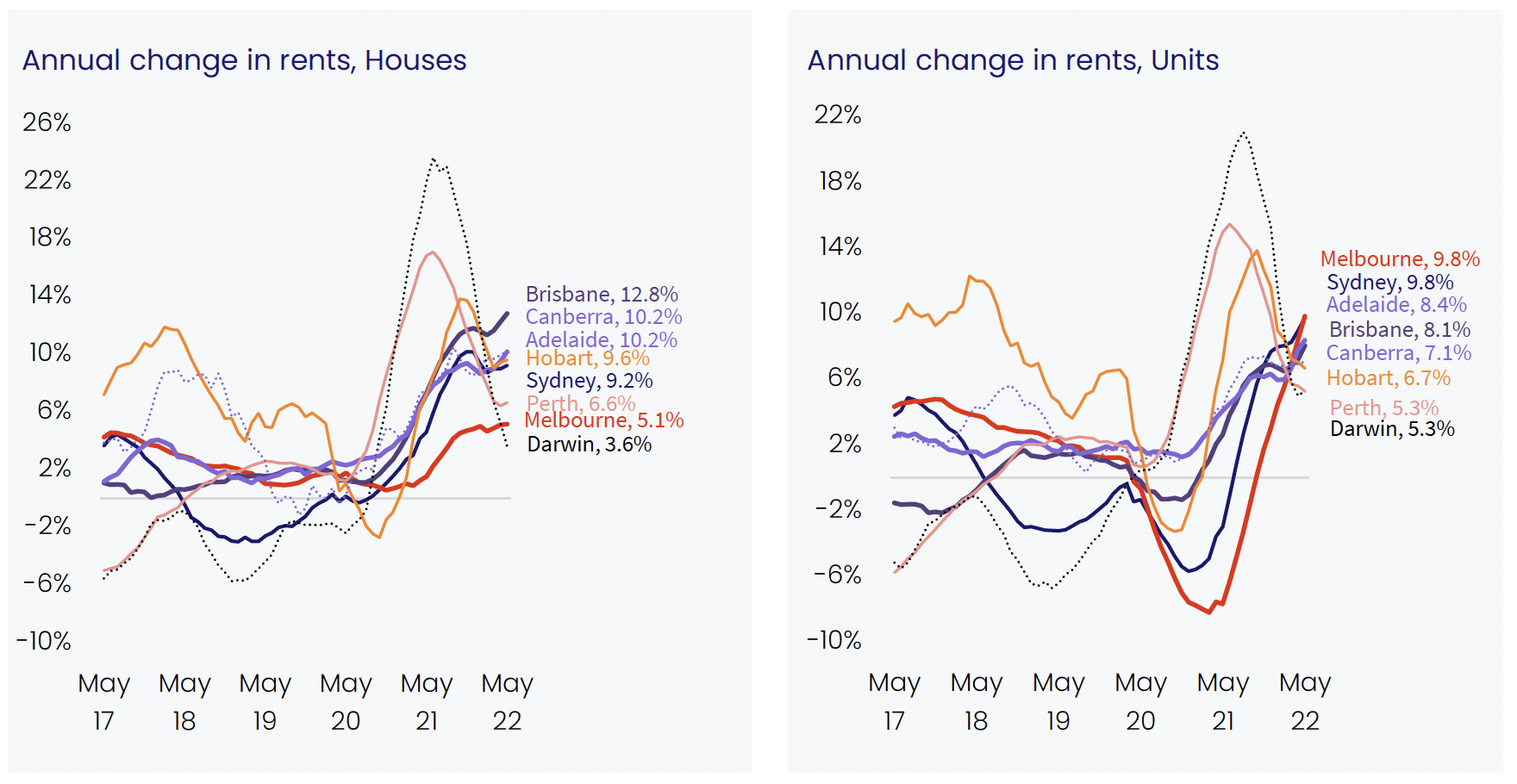 Brisbane has seen the most significant jump in rental prices, a whopping 12.8%, followed by Canberra, Adelaide 10.2%, Hobart at 9.6%, Sydney 9.2%, Perth 6.6%, Melbourne 5.1%, and Darwin 3.6%