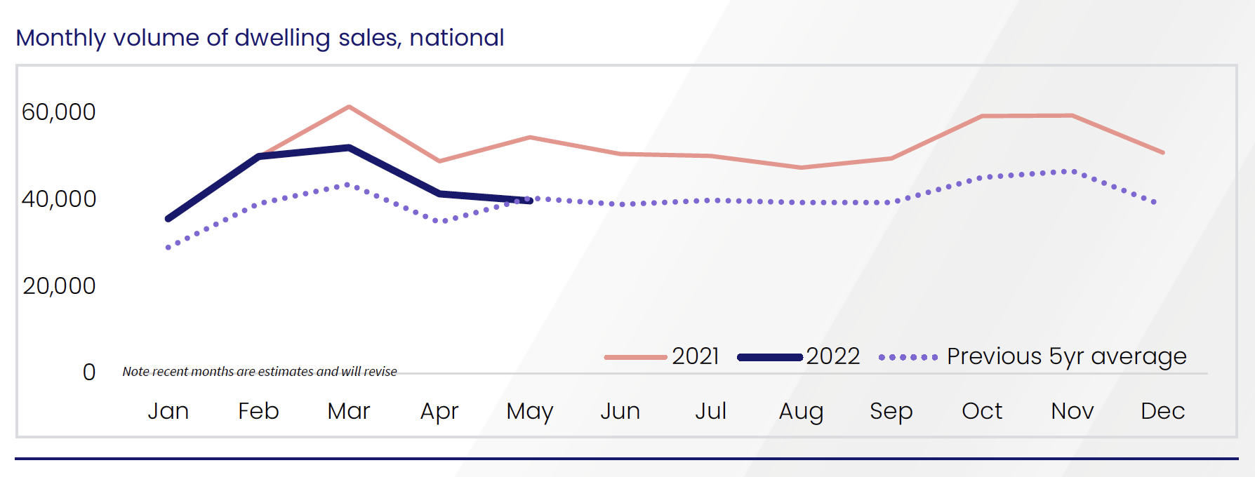 " Settled sales estimates from CoreLogic indicate dwelling sales over the three months to the end of May were -19% lower than at the same time a year ago. A similar trend can be seen in home lending data from the ABS, where the number of new mortgage commitments is also trending lower.”