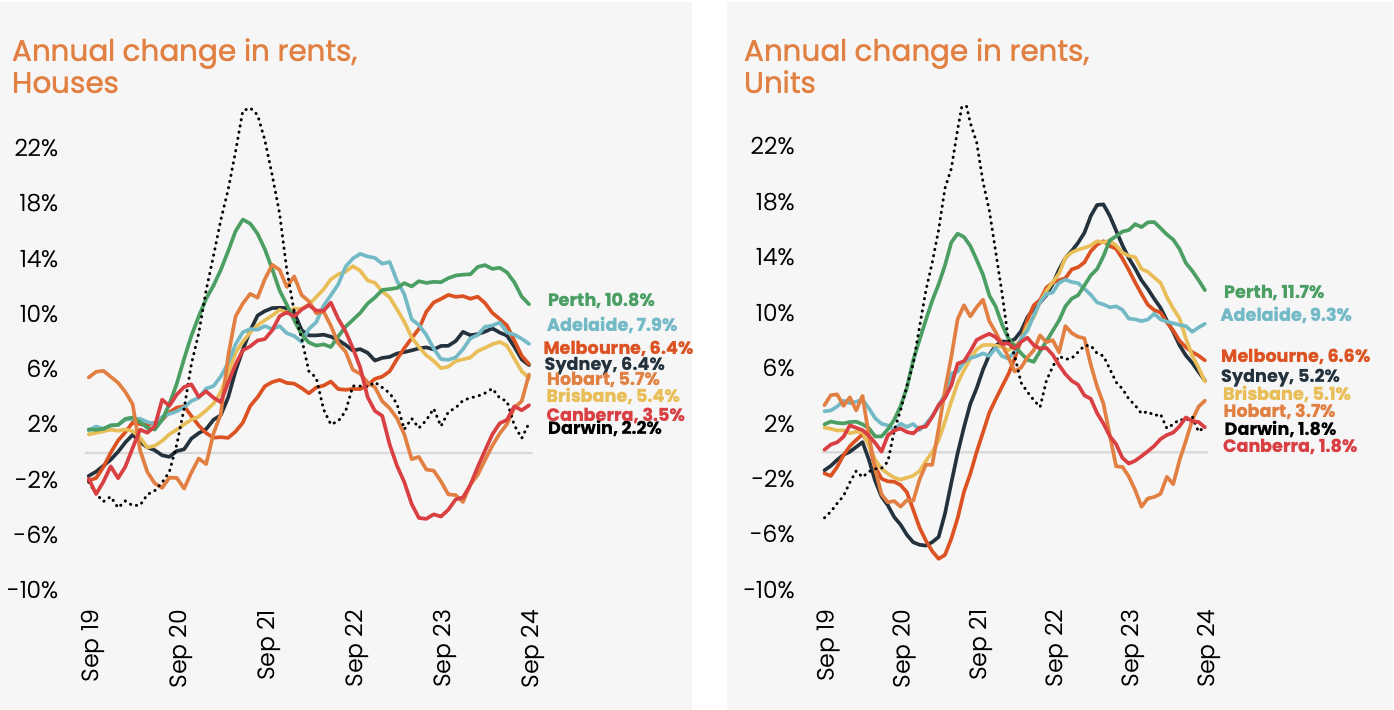 Sydney (-0.5%), Brisbane (-0.2%), and Canberra (-0.8%) all saw rent decreases this quarter, and many other capitals are experiencing slower rental growth. Melbourne and Perth each had a 0.3% increase in rents this quarter, a significant drop from a year ago when rents rose by 2.2% and 2.3%, respectively.
