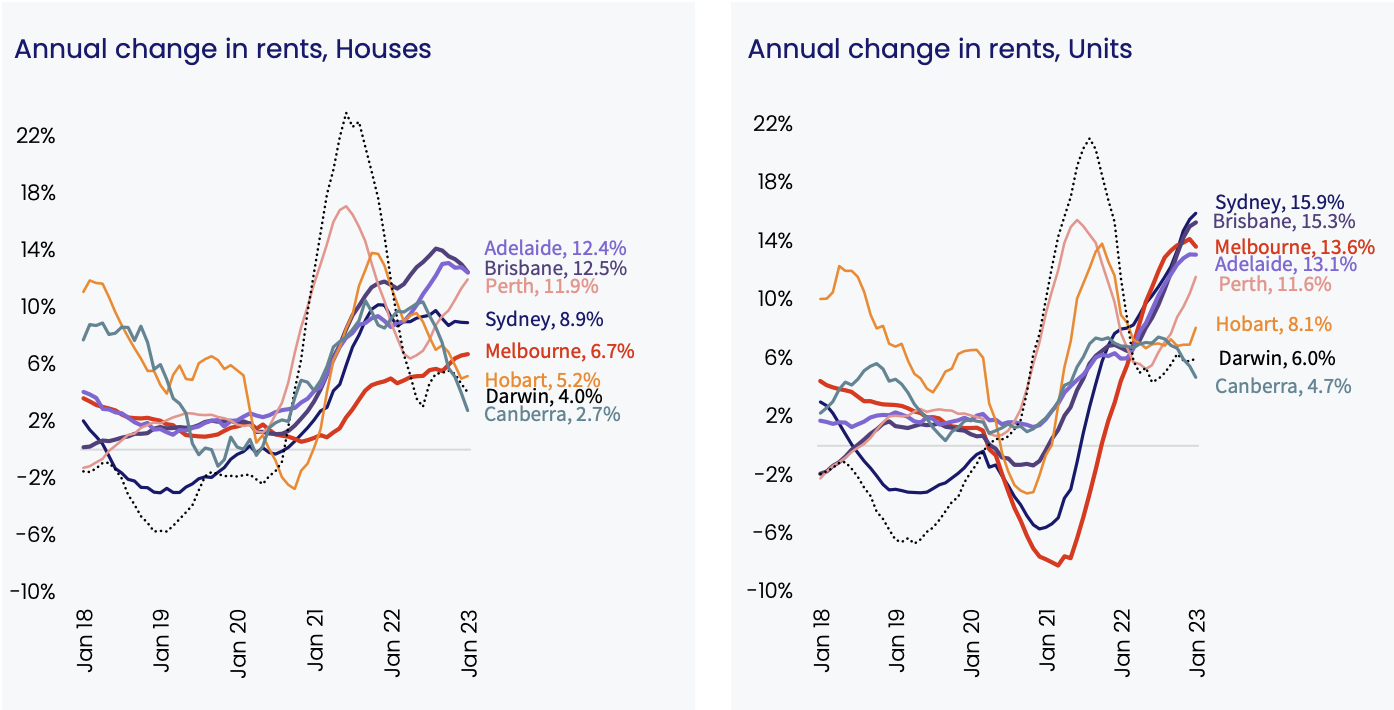 Housing Rental Market in Adelaide, Brisbane, Sydney, Hobart and Melbourne rents increades have stabilised. Perth is yet to reach its peak, and Canberra is still yet to reach the bottom of its decline.