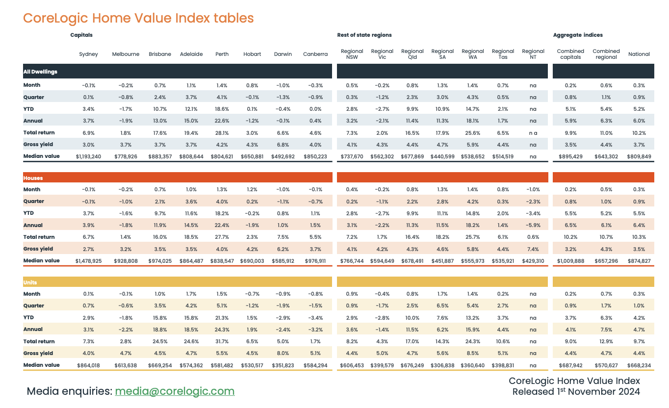 CoreLogic Home Value Index report HVI November 2024 and Property Pulse Update.