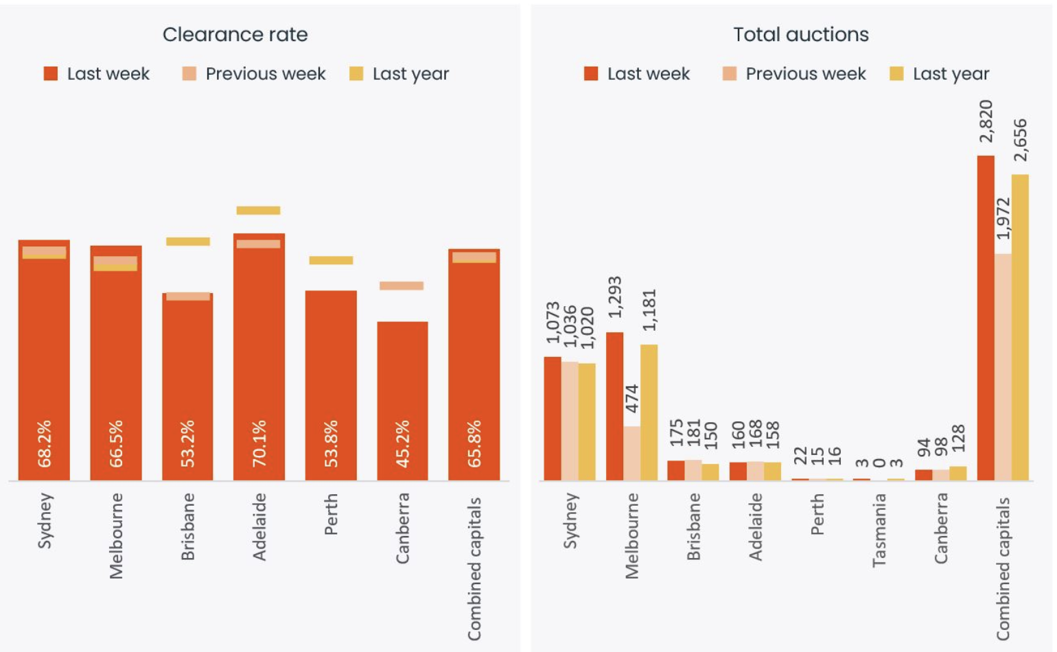Last week, there were 2,820 auctions, the second-highest number this spring and the fifth-highest in 2024. The preliminary clearance rate was 65.8%, up 2.4 points from the previous week but slightly below the spring average of 67.1%. Melbourne had the most auctions, with 1,293 homes, the third-highest this spring. The success rate for auctions was 66.5%, up from 62.4% last week and in line with the spring average of 66.4%.
