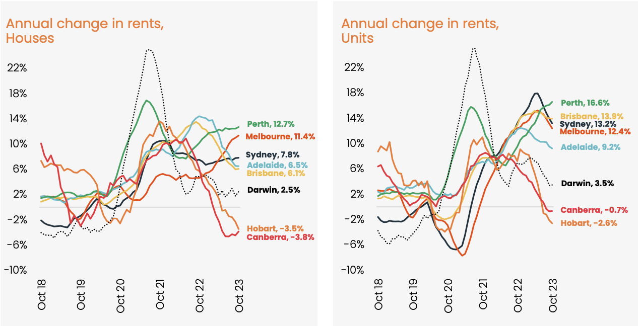 In October, there were very few rental vacancies, reaching a record low of 0.9% in the capital cities and 1.2% in regional markets. Rental listings were significantly below the average, decreasing by 35.5% compared to the previous five years and 16.1% compared to last year. Despite a shortage of rental properties, rent prices have been steadily increasing for the past 39 months. However, the rate of rent growth has slowed down and become more varied, especially in the unit sector. House rents are rising faster than unit rents in Sydney and Melbourne, possibly due to university semesters and foreign student arrivals. Perth has seen the highest annual rental growth, with a 12.7% increase in house rents and a 16.6% increase in unit rents. On the other hand, Hobart and Canberra have average vacancy rates and falling rents on an annual basis. Gross rental yields peaked between February and April at 3.73% nationally but have since decreased to 3.69% in October. Despite rising rents, it is challenging to find an investment property with positive cash flow due to high debt, maintenance costs, and holding expenses.