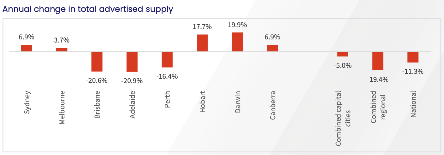 “In weaker markets like Melbourne and Sydney, advertised supply levels have normalised. Sydney advertised stock levels are roughly in line with the previous five-year average, while listings in Melbourne were 8.2% higher. Higher stock levels across these markets can be explained by an above-average flow of new listings coming on the market in combination with a drop in buyer demand.