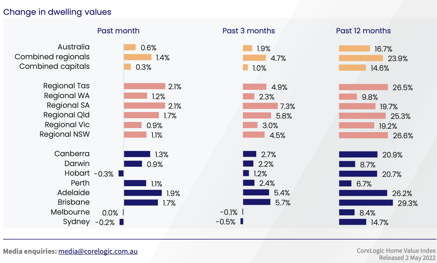 Regional SA was the most robust in the regional group, with a remarkable 7.3% increase in dwelling value for the 1st Quarter.
